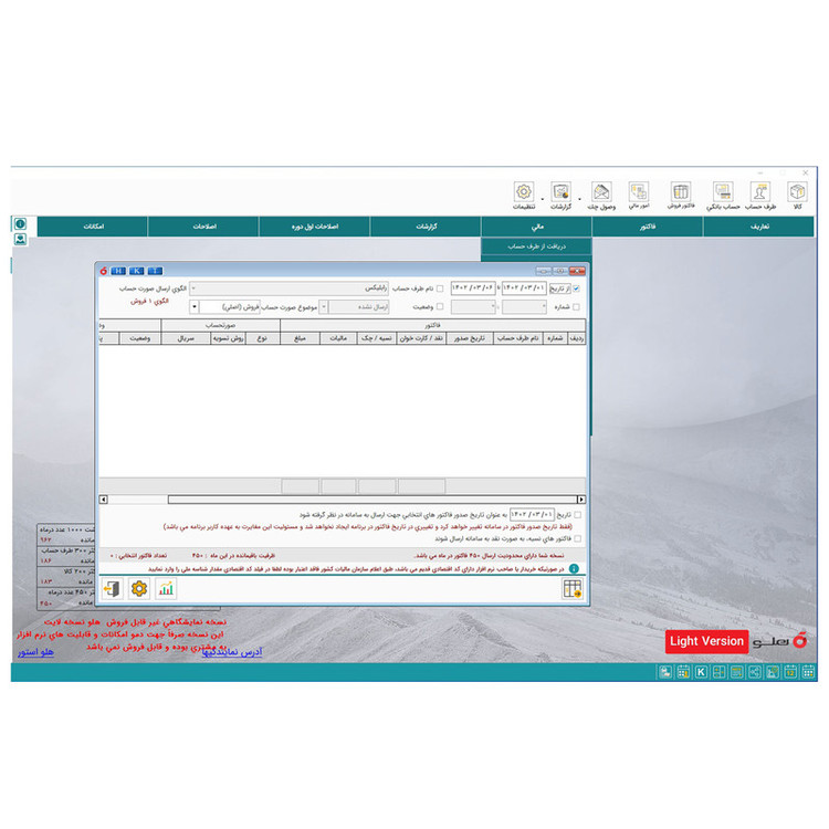 شدن اطلاعات (۴ مرتبه در سال) امکان اتصال به سامانه مودیان و ارسال صورت حساب الکترونیکی (ارسال ۴۵۰ مورد در ماه) قابلیت ارتقا به نسخه های بالاتر برای دریافت امکانات بیشتر در هر زمان