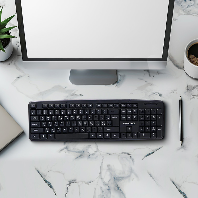 کیبورد ایکس پی پروداکت مدل XP-8000K یک صفحهکلید باسیم است که برای کارهای اداری و خانگی طراحی شده است. این محصول دارای ابعادی برابر با ۵۵۰ در ۱۵۰ در ۳۰ میلیمتر بوده و تنها ۳۰۰ گرم وزن دارد. بدنه پلاستیکی آن، علاوه بر سبکی، مقاومت کافی برای استفاده طولانیمدت را فراهم میکند. وجود ۱۰۴ کلید با حروف حک شده فارسی و فرم فولسایز باعث میشود تا فرایند تایپ سریع و راحتی داشته باشید. همچنین ۱۲ کلید میانبر در این کیبورد تعبیه شده است تا کاربر بتواند به امکانات متنوعی مانند کنترل موسیقی یا باز کردن مرورگر، سریعتر دسترسی پیدا کند.نوع سوییچ این صفحهکلید، ممبران است که با داشتن صدای کم و عمر مفید تا ده میلیون ضربه برای هر کلید، عملکردی قابلاعتماد ارائه میدهد. این کیبورد با اتصال USB، به انواع رایانهها و لپتاپها متصل میشود و نیاز به درایور یا تنظیمات خاصی ندارد. طراحی ضدلغزش در بخش زیرین، موجب میشود کیبورد هنگام تایپ، حرکت نکند. این محصول بهواسطه سادگی و کارایی مناسب، گزینهای ایدهآل برای استفادههای روزمره در محیط کار یا خانه محسوب میشود. در مجموع، XP-8000K میتواند نیازهای کاربران عادی را به شکلی مقرونبهصرفه برآورده سازد.